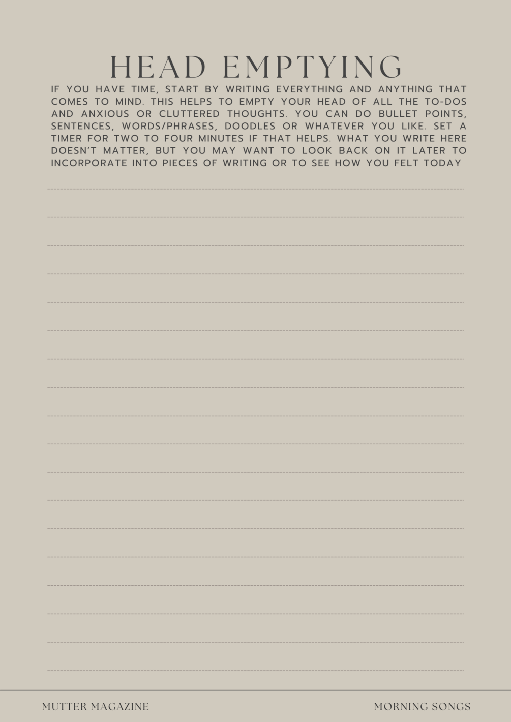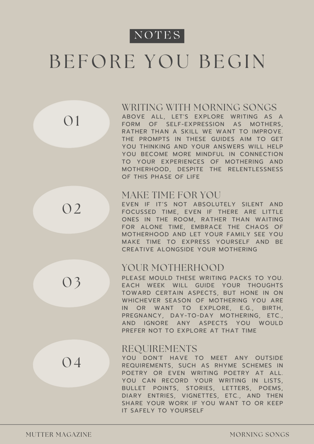 pay as much as you like for a download of a set of five creative writing guides from mutter magazine's MORNING SONGS sessions: you will receive 40+ pages of prompts, quotes and reading recommendations